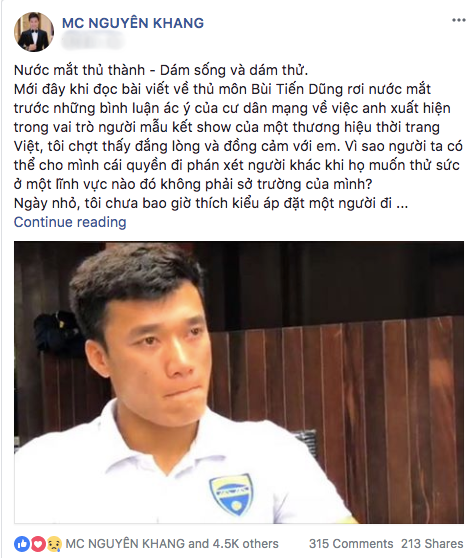 Trên fanpage chính thức, MC Nguyên Khang chia sẻ tâm thư khá dài nhằm khích lệ, động viên tinh thần Bùi Tiến Dũng. Xuất phát điểm từ sinh viên Bách Khoa và “đá chéo” sang nghề MC, Nguyên Khang thực sự đồng cảm với cầu thủ gốc Thanh Hoá. Anh cho rằng việc thử sức ở một lĩnh vực không phải sở trường của mình là điều hoàn toàn đáng hoan nghênh.
