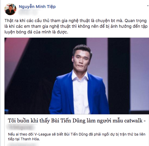 Đồng tình với MC Nguyên Khang, nam diễn viên Minh Tiệp bày tỏ quan điểm trên trang cá nhân: “Thật ra khi các cầu thủ tham gia nghệ thuật là chuyện bình thường mà. Quan trọng là khi các em tham gia nghệ thuật thì không nên để bị ảnh hưởng đến tập luyện bóng đá của mình là được”.