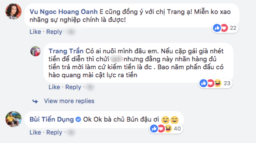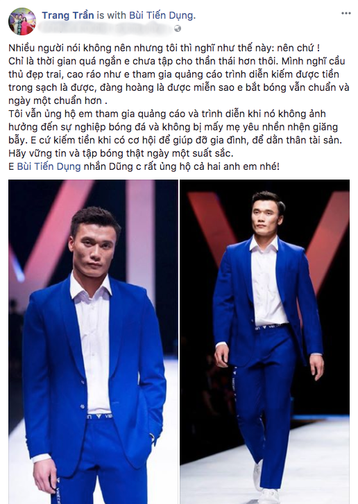 Trước đó, Trang Trần cũng thắng thắn lên tiếng phản bác những quan điểm “ném đá” Bùi Tiến Dũng. Cô cho rằng việc kiếm tiền từ nghề người mẫu hay đi sự kiện, quảng cáo không hề đáng bị lên án: “Chỉ cần trong sạch, đàng hoàng là được, miễn sao em bắt bóng vẫn chuẩn và ngày một chuẩn hơn. Em hãy cứ kiếm tiền khi có cơ hội để giúp đỡ gia đình, dằn thân tài sản. Hãy tự tin và tập bóng ngày một xuất sắc”.