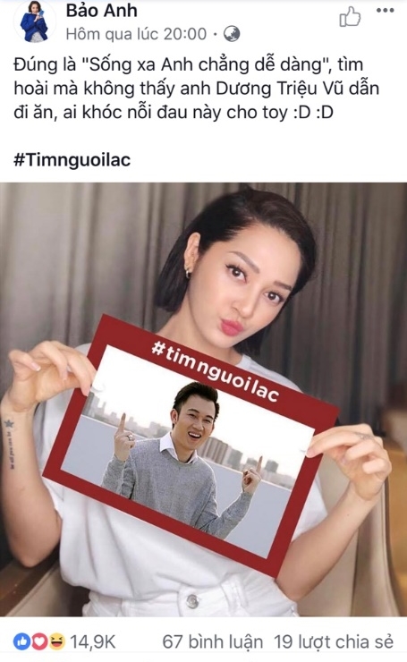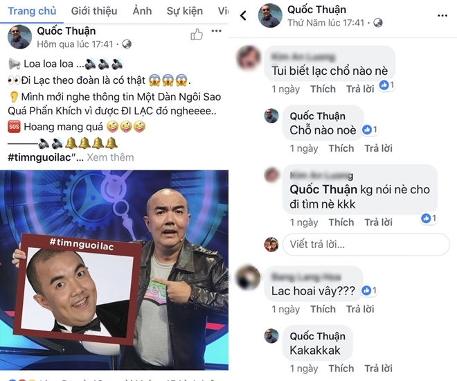 Chuyện người mất tích được gia đình, người thân đăng đàn tìm kiếm vốn thường thấy. Nhưng mới đây, trên mạng xã hội bỗng nở rộ trào lưu tìm người lạc với hashtag “timnguoilac” được các sao Việt đăng tải. Nghệ sĩ Quốc Thuận chia sẻ trên trang cá nhân rằng rất nhiều sao phấn khích vì được đi lạc khiến anh hoang mang.