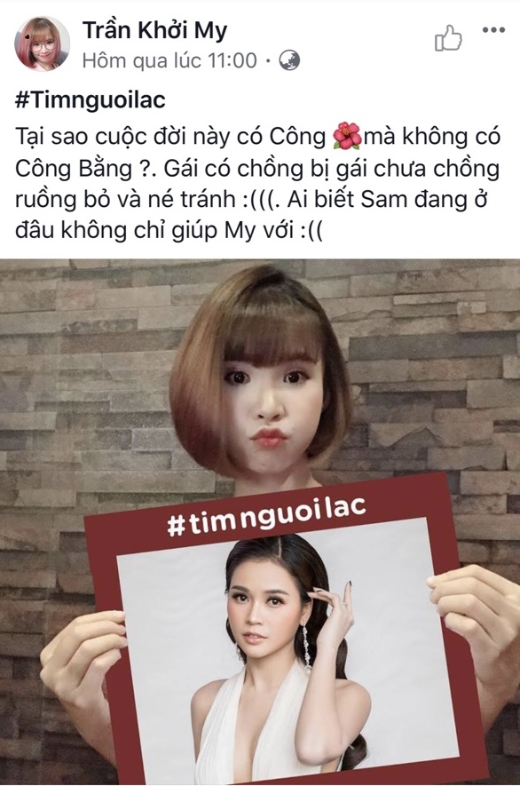 Không dừng ở đó, Khởi My cũng tỏ ra lo ngại khi không liên lạc được với hot girl Sam. Nữ ca sĩ 9X bày tỏ bức xúc khi viết: “Tại sao trên đời có công mà lại không công bằng. Gái có chồng bị gái chưa chồng ruồng bỏ và né tránh. Ai biết Sam đang ở đâu không chỉ giúp My với”.