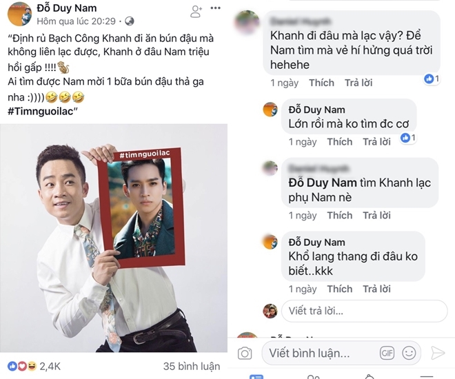 Sự hoang mang càng được đẩy lên cao độ bởi lời nhắn của Đỗ Duy Nam hướng đến Bạch Công Khanh vừa đầy ẩn ý, vừa đủ khiến ai đọc cũng phì cười: “Định rủ Bạch Công Khanh đi ăn bún đậu mắm tôm mà không liên hệ được, Khanh ở đâu Nam triệu hồi gấp !!!! Ai tìm được Nam tặng 1 bữa bún đậu mắm tôm nha”. Chẳng biết, câu chuyện ăn bún đậu mắm tôm mà Duy Nam muốn ám chỉ ở đây là gì? Liệu sau khi ăn bún đậu mắm tôm cùng nhau, cả hai sẽ không còn bị thất lạc hay sao?