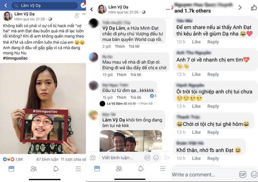 Các sao liên tục cập nhật dòng trạng thái tìm người thân, mới đây Lâm Vỹ Dạ cũng vừa rao trên mạng tìm chồng lạc khiến người hâm mộ thêm nghi vấn và buồn cười với biểu cảm ‘đau khổ’ của cô và lời ‘tố’ chồng trên Facebook: “Sau sự cố mất “vợ hai” thì anh Đạt vì quá đau buồn mà đã đi lạc, khi đi không quên mang theo thẻ ATM và cuỗm luôn thẻ của em. Anh đang ở đâu về gấp gấp vì cả nhà đang mong”.