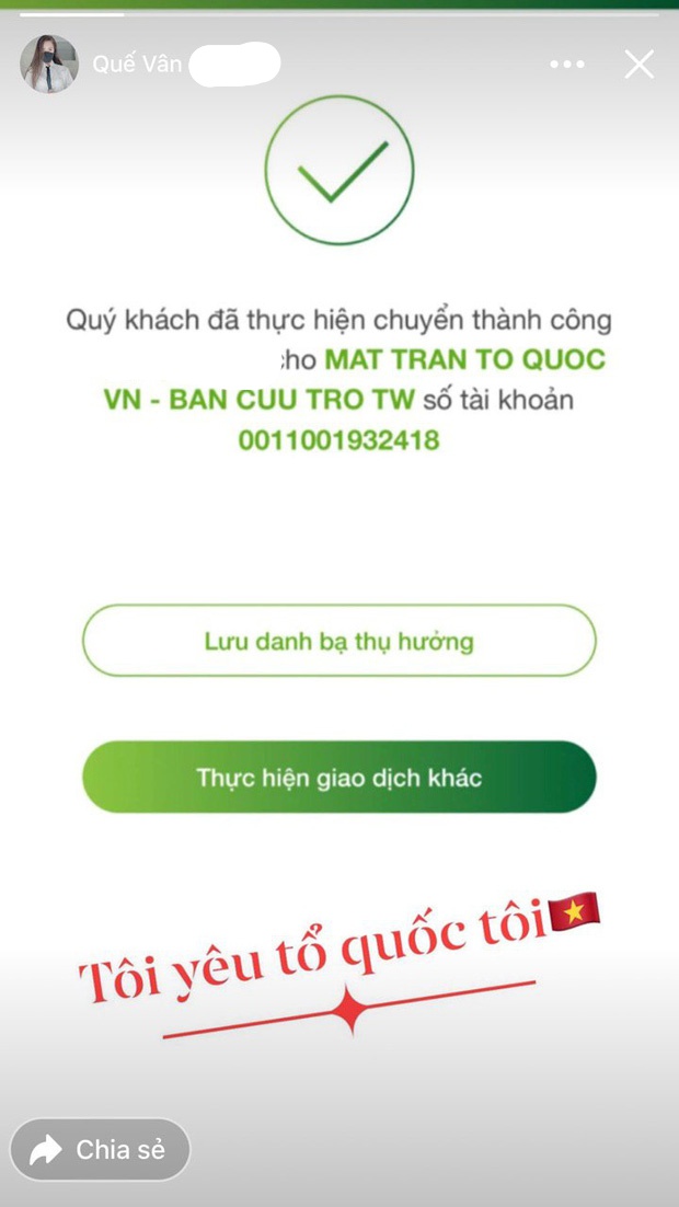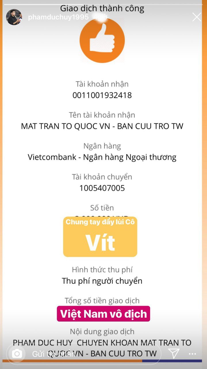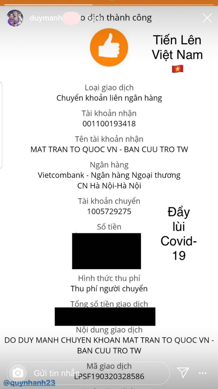 Minh Tú cũng là nghệ sĩ tiếp theo chung tay ủng hộ Quỹ phòng chống Covid-19 thông qua hình thức chuyển khoản. Trên trang cá nhân của Minh Tú, người đẹp cũng đã chia sẻ hình ảnh chuyển khoản và che đi số tiền gửi đi. Hành động của Minh Tú cũng thực sự nhận được nhiều lời khen từ phía người hâm mộ, bởi vì theo như chia sẻ trước kia của cô, “của ít lòng nhiều”.