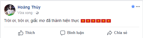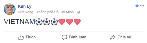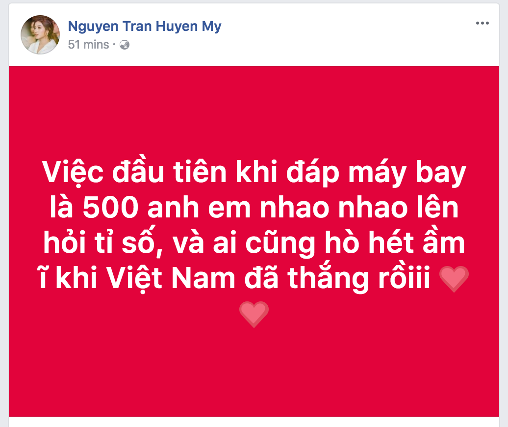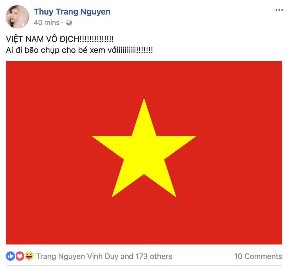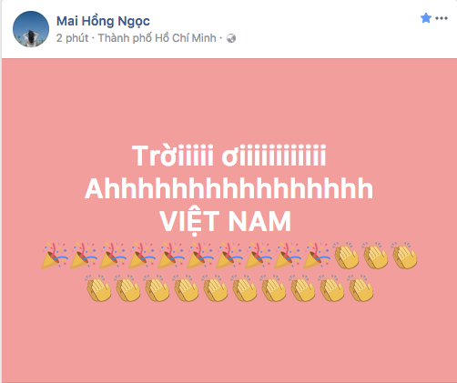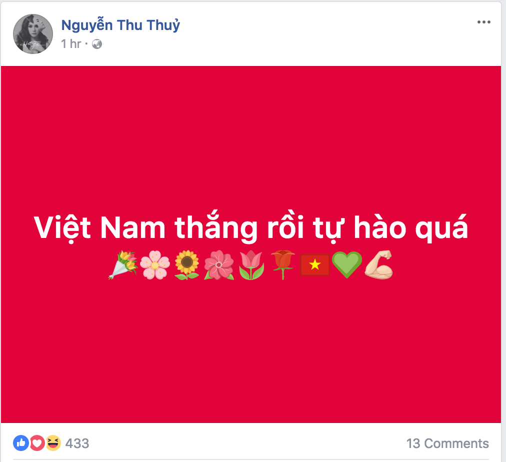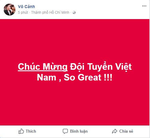 Rất đông người hâm mộ đã bày tỏ nỗi xúc động, niềm hạnh phúc, tự hào dân tộc trước chiến thắng của đội tuyển Việt Nam. Đặc biệt, trên trang cá nhân của rất nhiều sao Việt như Đông Nhi, Tóc Tiên, Hari Won, Bảo Anh, Thanh Hằng, H'Hen Niê, Mỹ Duyên, cũng không giấu nổi sự vui mừng.