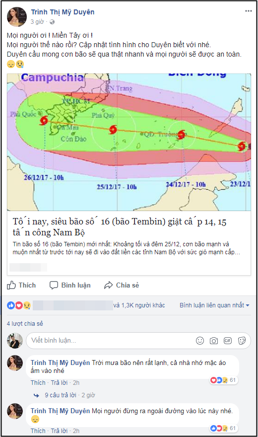 Trước những thiệt hại đầu tiên của bão Tembin, BB Trần cũng đặc biệt cầu bình an cho người dân khu vực Nam bộ.