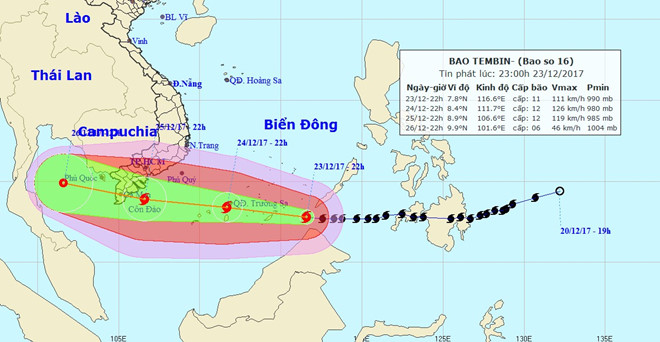 Hình ảnh và hướng đi của siêu bão Tembin uy hiếp các tỉnh Nam bộ.