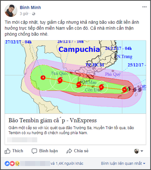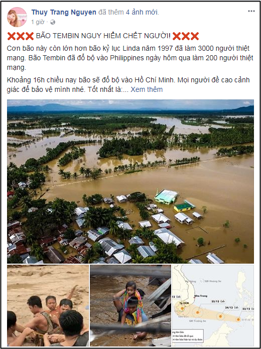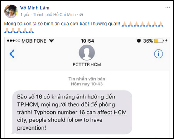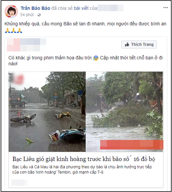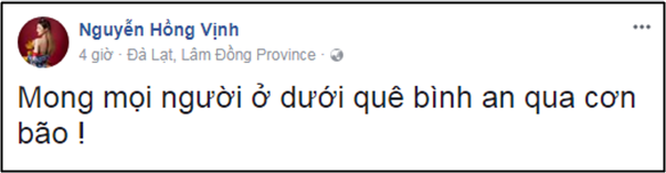 Không dừng lại ở đó, hàng loạt những thông tin cũng như cách đề phòng, phòng chống thiệt hại của cơn bão số 16 - Tembin cũng được các sao Việt cập nhật liên tục trên trang cá nhân.