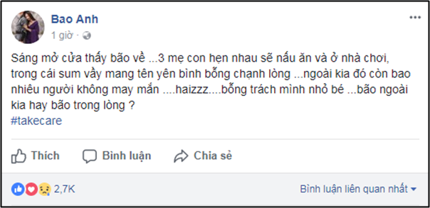 Bảo Anh cũng chia sẻ tình cảm cũng những số phận người dân cực khổ đang oằn mình chống bão, giọng ca trẻ trách bản thân vì không thể giúp đỡ gì hơn trong khoảnh khắc này. Bên cạnh đó, dù đang ở Đà Lạt cùng với lịch trình của mình, song Hải Yến Idol, Shin Hồng Vịnh vẫn đặc biệt cập nhật những tin tức mới nhất về bão Tembin trên trang cá nhân.