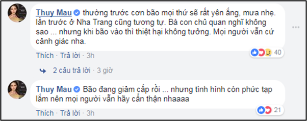 Nếu như Hoàng Thùy liệt kê riêng một danh mục những việc cần làm để chống bão thì Mâu Thủy liên tục cập nhật tình hình Tembin tại Việt Nam. Quán quân Next Top Model 2014 chia sẻ “Thường trước cơn bão mọi thứ sẽ rất yên ắng, mưa nhẹ. Lần trước ở Nha Trang cũng tương tự! Bà con chủ quan nghĩ không sao nhưng khi bão vào thì thiệt hại không tưởng. Mọi người vẫn cứ cảnh giác nha”.