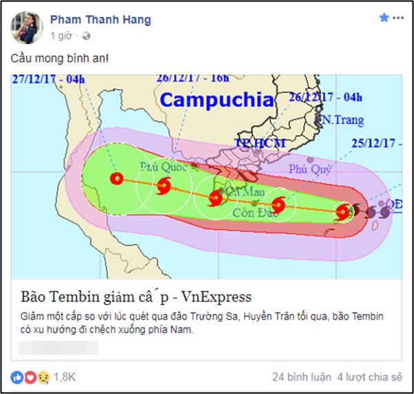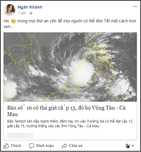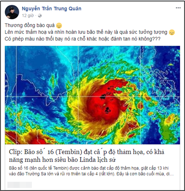 Việc cơn bão số 16 - Tembin chỉ cách đất liền hơn 200 km, chuẩn bị hoành hành nước ta khiến người dân vô cung hoang mang và lo lắng. Trên các mạng xã hội, không chỉ giới trẻ mà bản thân các sao Việt cũng nóng như lửa đốt khi đọc những thông tin về bão mạnh Tembin đang hướng vào miền Nam. Ai ai cũng liên tục cập nhật tin tức bão.