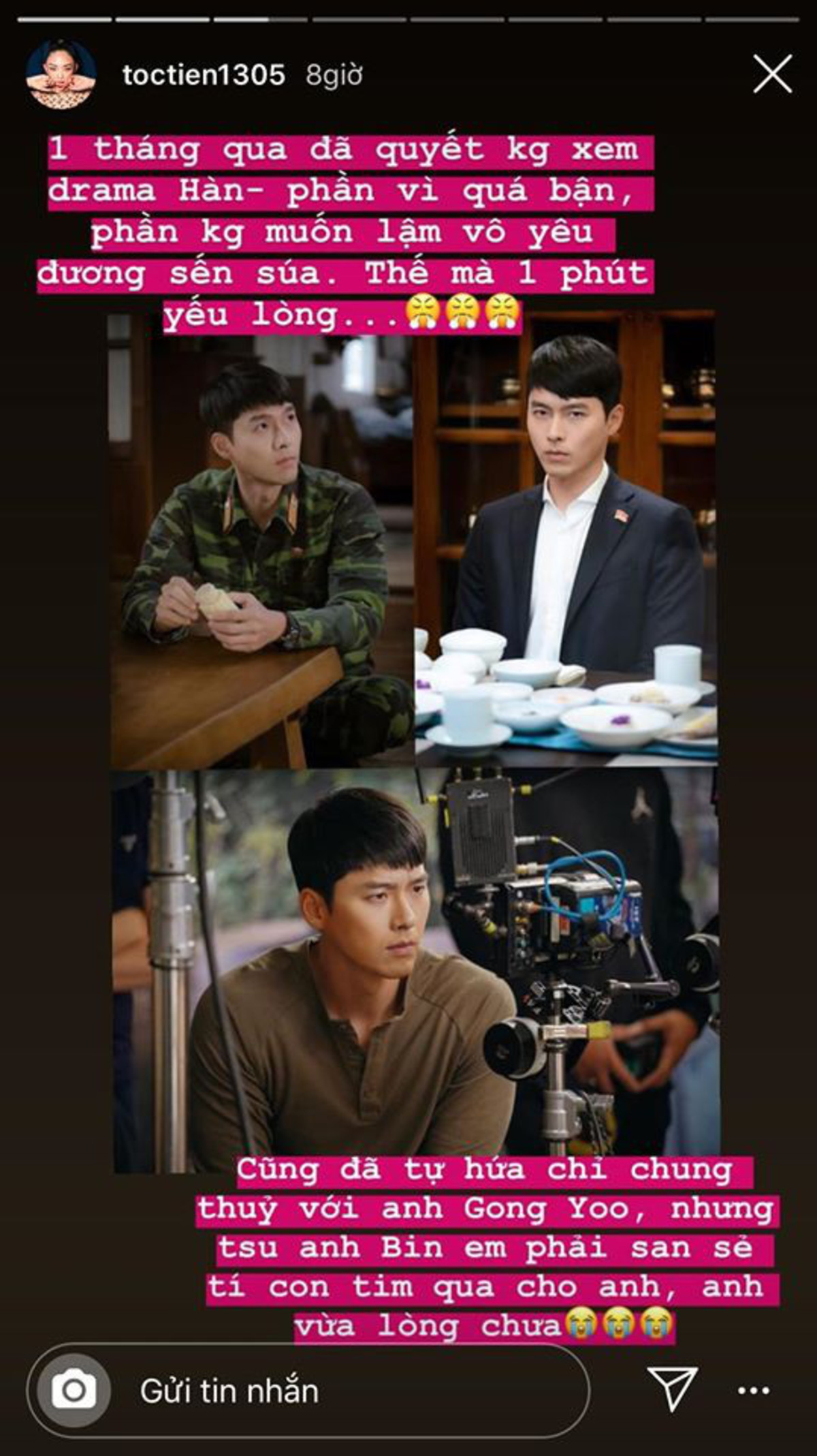 Tóc Tiên chia sẻ: “Anh Hyun Bin ơi! Em nè, người em gái bị dính lời nguyền xem phim anh xong, bỗng ngớ ngẩn u mê nè”.