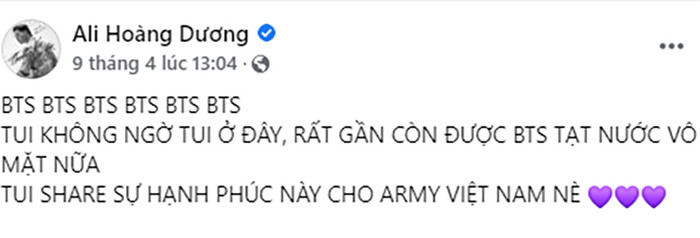Trên trang Facebook, Ali Hoàng Dương phấn khích viết: "Tôi không ngờ là tôi ở đây, rất gần còn được BTS tạt nước vô mặt nữa. Tôi sẽ chia sẻ sự hạnh phúc này cho ARMY Việt Nam nè".