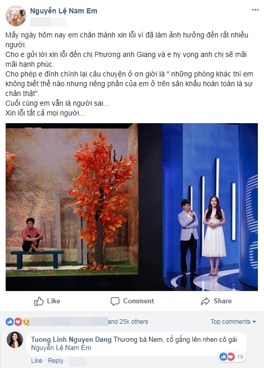 Giữa những ý kiến chỉ trích, Tường Linh là người đẹp hiếm hoi lên tiếng động viên Nam Em. Cô bình luận ngắn gọn dưới bài đăng xin lỗi của đồng nghiệp: “Thương bà Nem. Cố gắng lên nhen cô gái”.