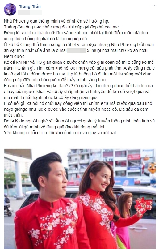 Về phần Trang Trần, cô nhận định Nam Em đã chấp nhận bước chân vào mối quan hệ với Trường Giang khi anh và Nhã Phương đang trục trặc thì không thể trách anh. Ngoài ra, cựu siêu mẫu cho rằng Nam Em dại dột khi lên tiếng tại thời điểm này và cô cần một người quản lý truyền thông giỏi, bản lĩnh để đưa gà nhà “về đúng quỹ đạo khi đang mất lái”.