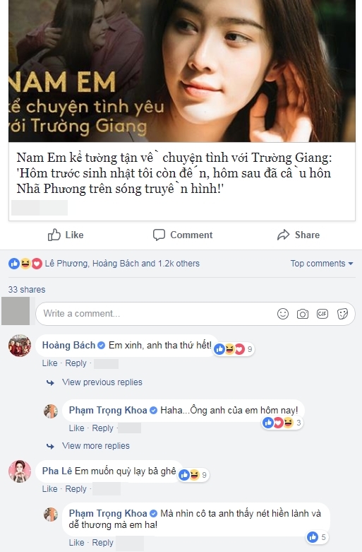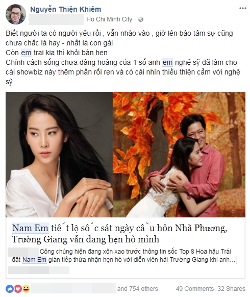 Ngay sau khi chia sẻ, thông tin lập tức “gây bão” dư luận. Nhiều người cho rằng ở thời điểm Trường Giang đang hạnh phúc với Nhã Phương sau ồn ào cầu hôn “chiếm sóng” Mai Vàng mới lắng xuống, những chia sẻ của Nam Em gây ảnh hưởng không nhỏ đến cặp đôi. Không chỉ khán giả, mà sao Việt cũng chia sẻ quan điểm về sự việc này.
