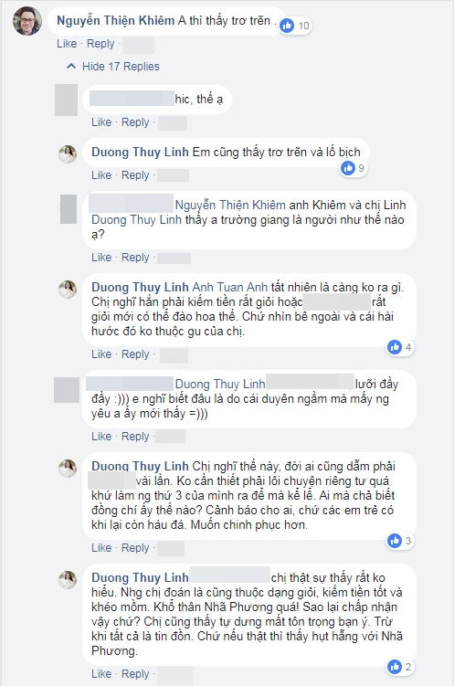Đồng quan điểm với Trang Trần, stylist Nguyễn Thiện Khiêm cho rằng việc Nam Em biết Trường Giang đã có Nhã Phương mà vẫn “đâm đầu” vào rồi lên báo kể lể không phải chuyện hay ho. Anh cũng ngầm chỉ trích cách sống của Trường Giang khiến làng giải trí thêm phần rối ren, khán giả có cái nhìn không hay về đời tư giới nghệ sĩ.