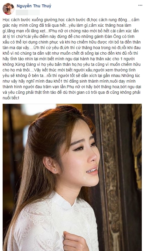 Trên trang cá nhân, Thu Thủy tỏ ra khá đồng cảm với những gì Nam Em đã trải qua. Dù vậy, từ những trải nghiệm của bản thân, giọng ca Think of you cho rằng phụ nữ khi yêu không nên quá đắm chìm trong cảm xúc để không nhận lại đau khổ, dằn vặt cho những người không xứng.