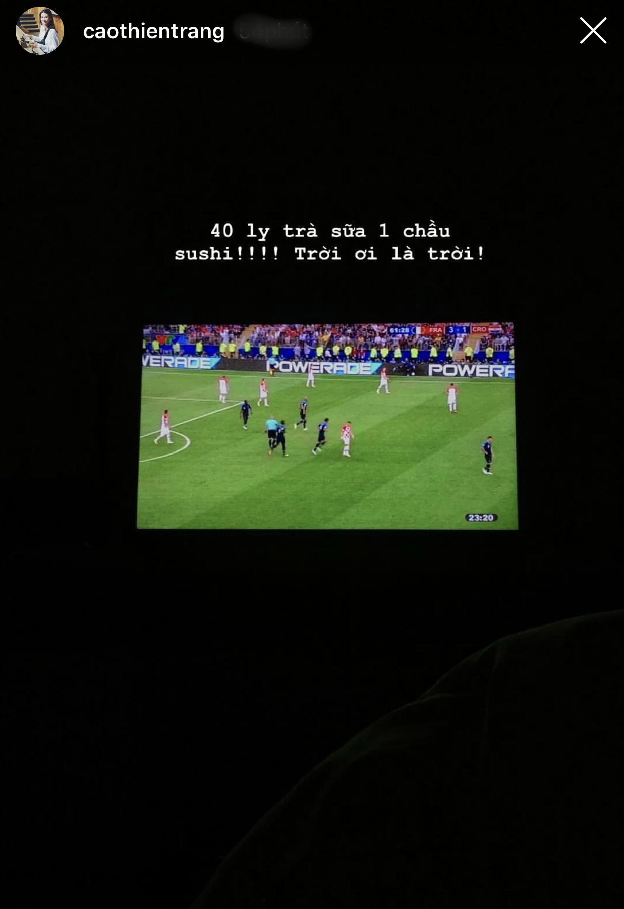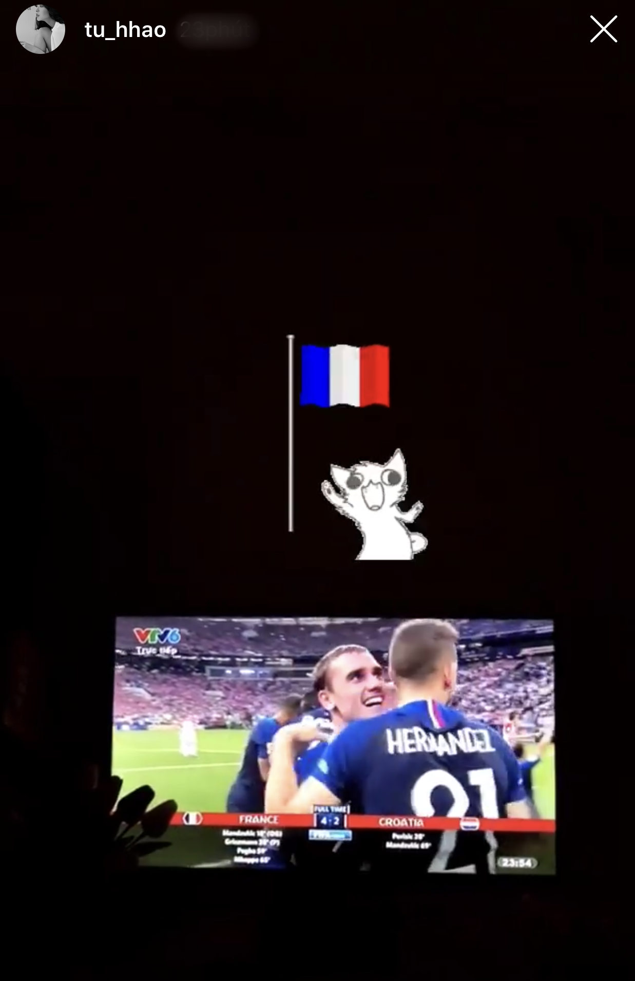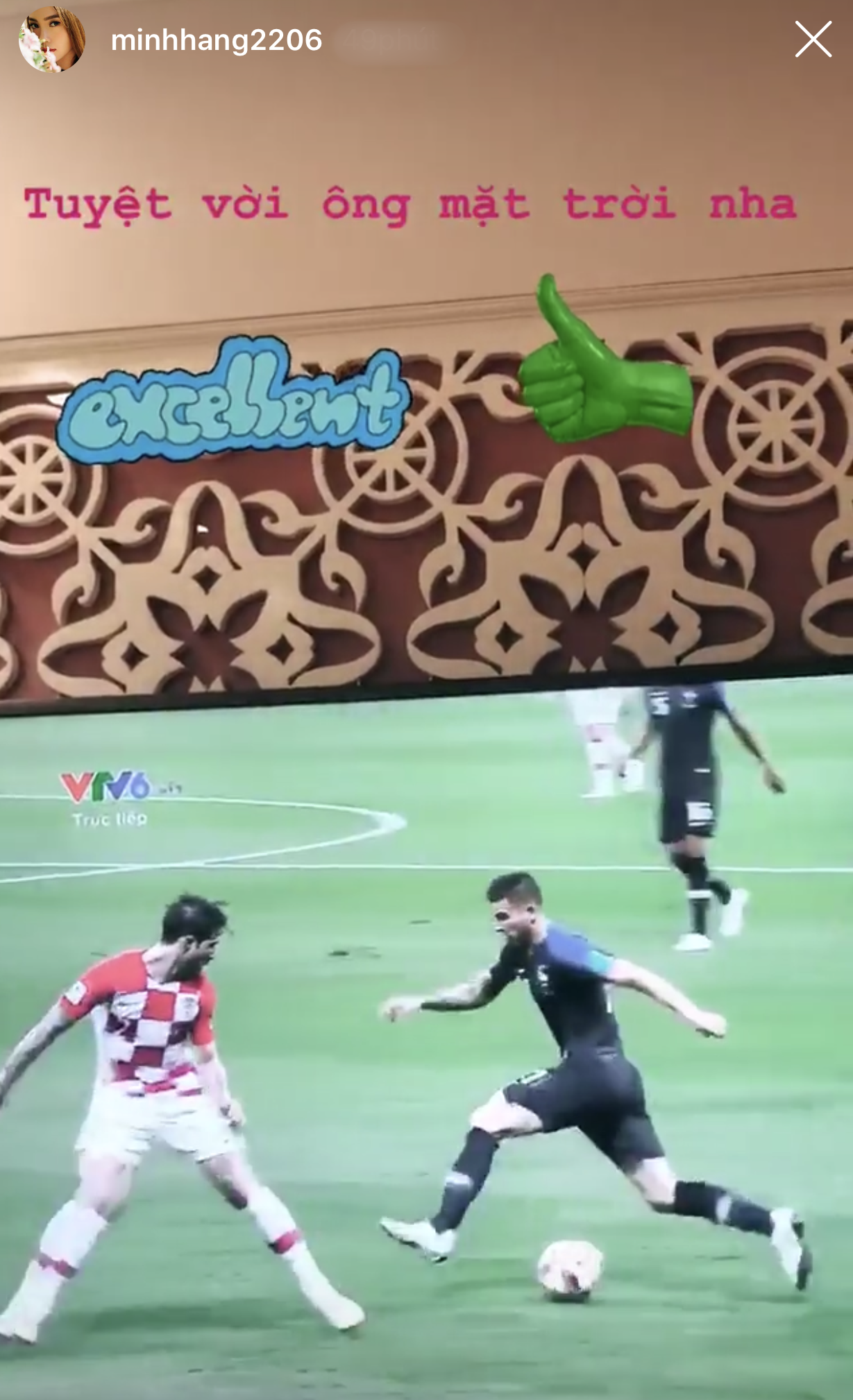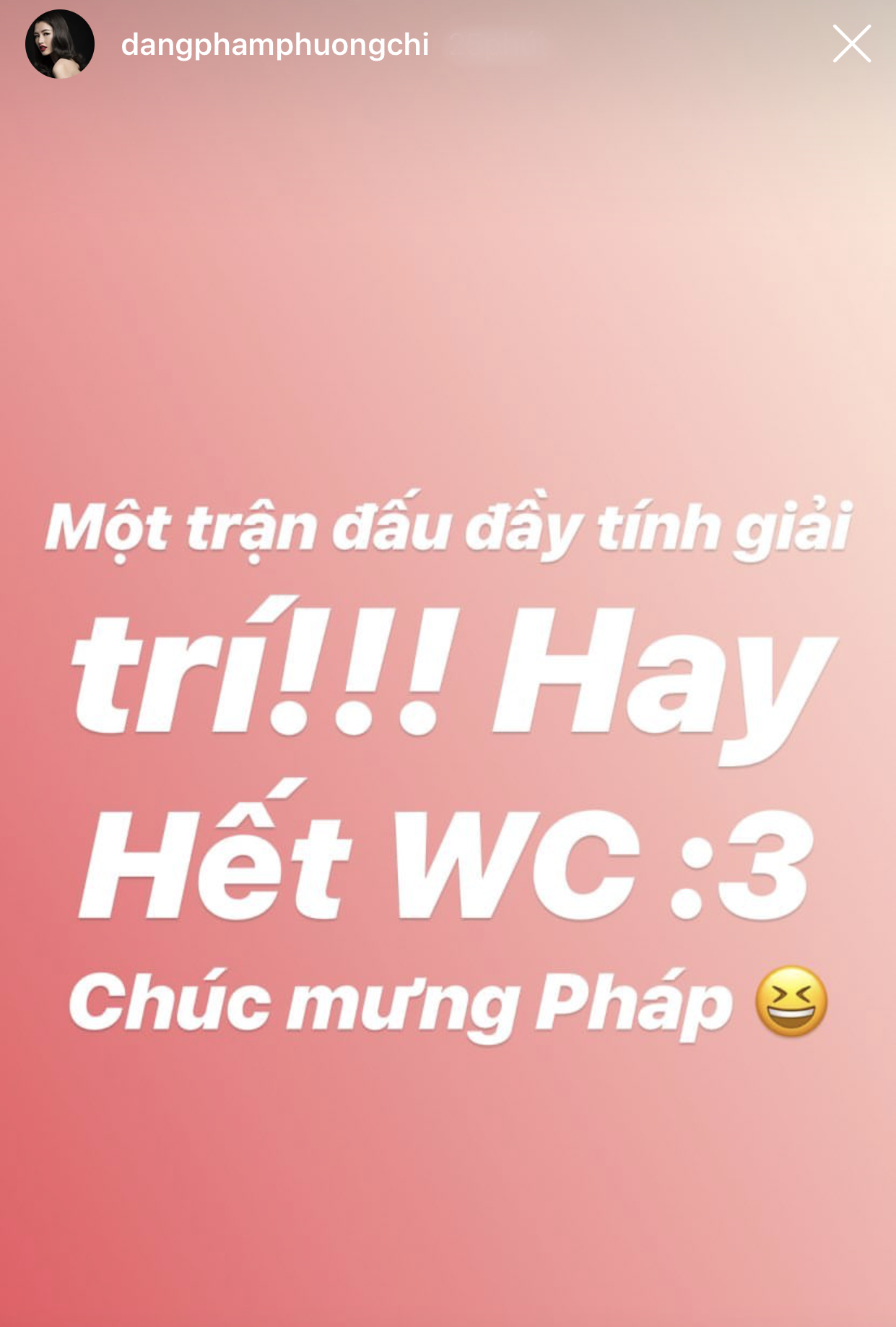 Phương Chi Gương mặt thương hiệu mùa 2 cho rằng đây là trận đấu đầy tính giải trí và không quên chúc mừng đội tuyển Pháp.