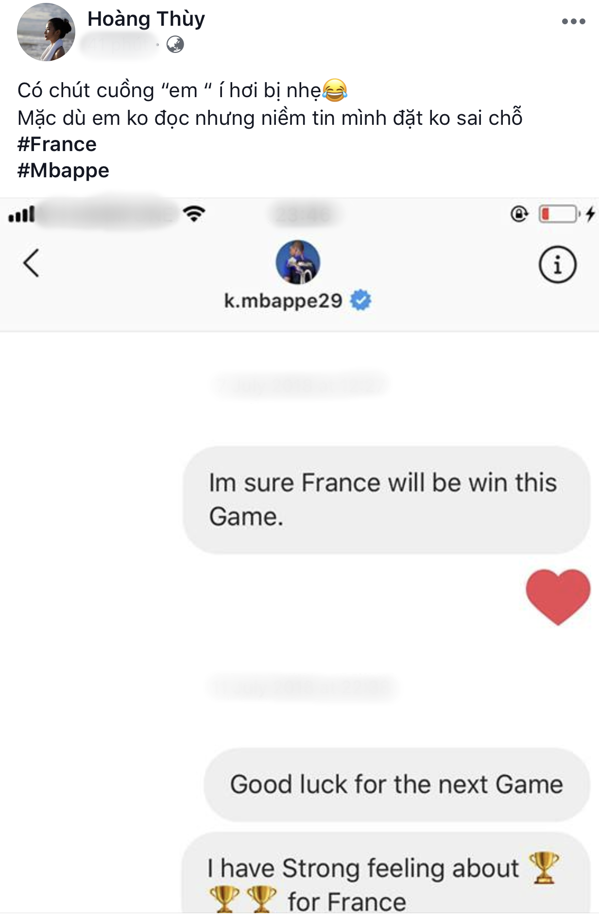 Hoàng Thuỳ “phát cuồng” với Kylian Mbappe của đội tuyển Pháp nên đã nhắn tin cho anh mặc dù biết rằng cầu thủ sẽ không đọc.