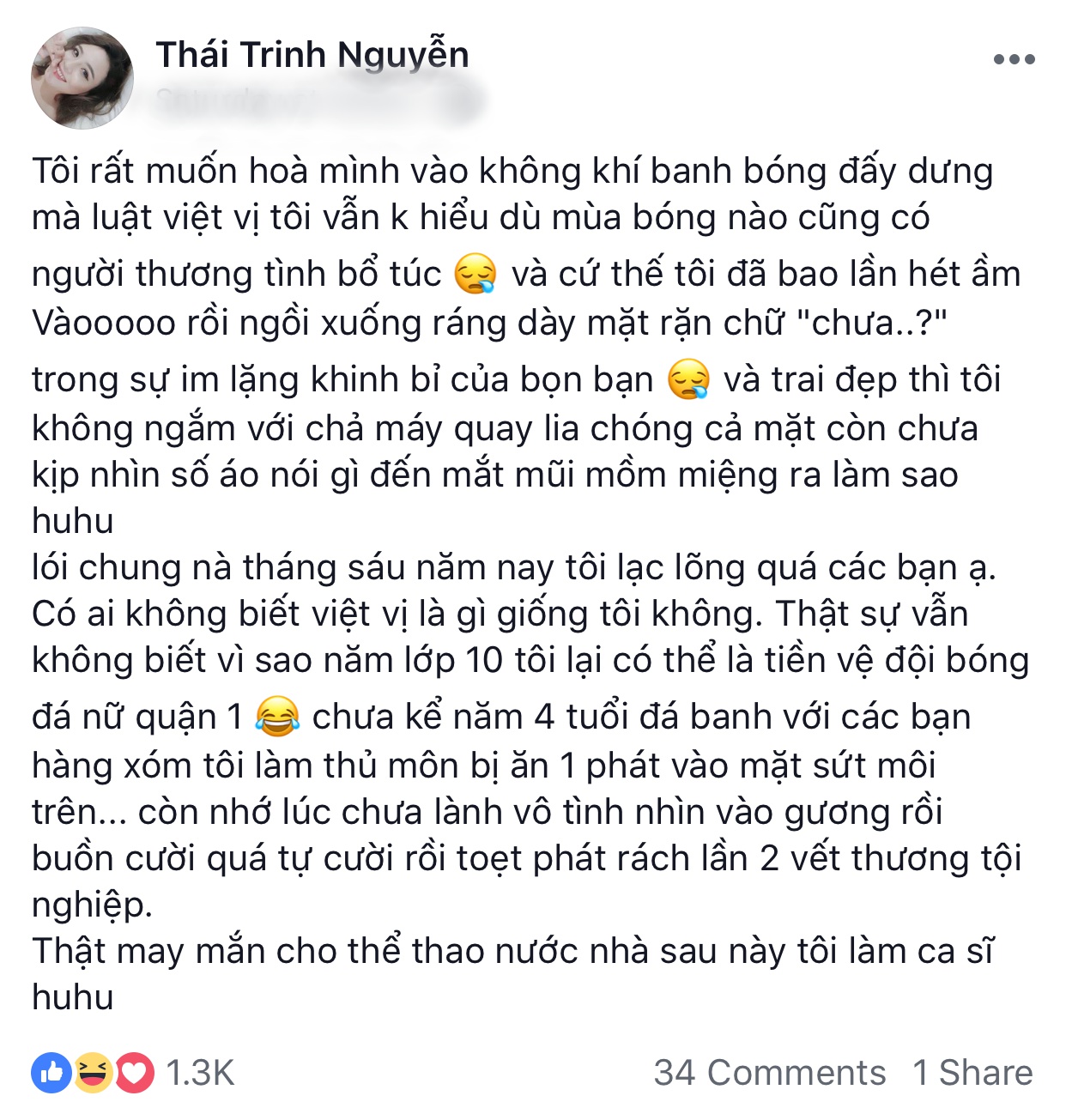 Dù rất muốn hoà mình vào không khí World Cup, Thái Trinh đành ngậm ngùi đứng ngoài cuộc vì… không hiểu nổi luật việt vị.