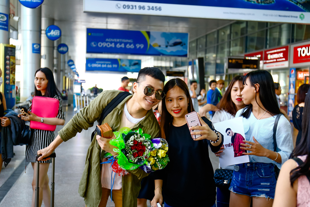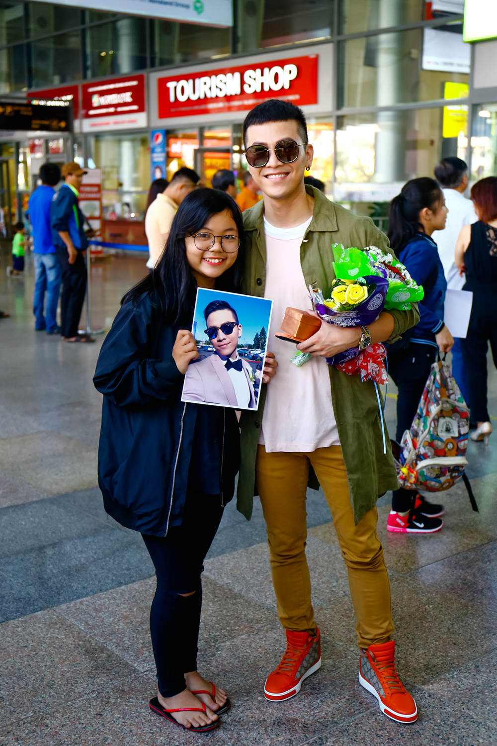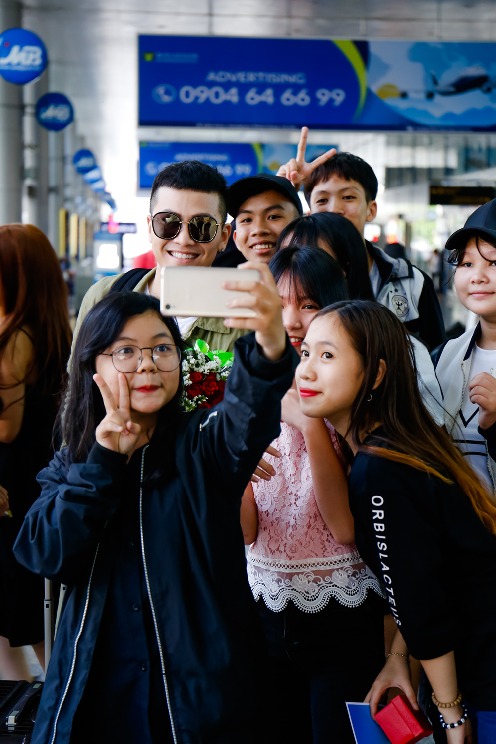 Mai Tiến Dũng chụp hình thân thiện cùng fan khi vừa có mặt tại sân bay Đà Nẵng.