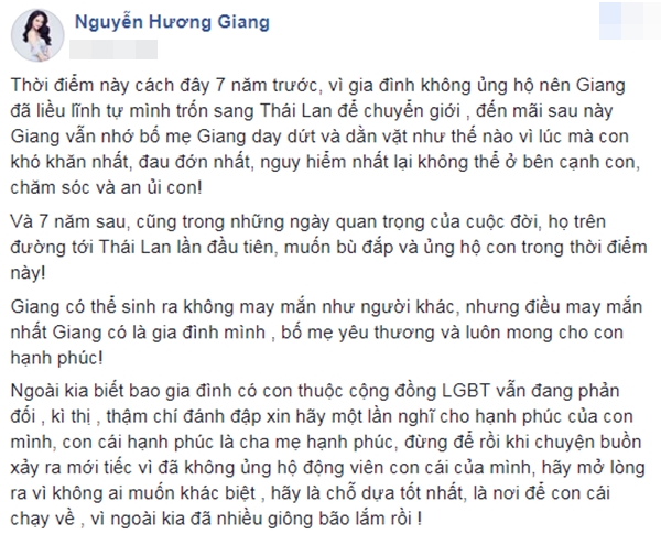 Cụ thể, Hương Giang Idol viết: “Thời điểm này cách đây 7 năm trước, vì gia đình không ủng hộ nên Giang đã liều lĩnh tự mình trốn sang Thái Lan để chuyển giới. Đến mãi sau này, Giang vẫn nhớ bố mẹ Giang day dứt và dằn vặt như thế nào vì lúc mà con khó khăn nhất, đau đớn nhất, nguy hiểm nhất lại không thể ở bên cạnh con, chăm sóc và an ủi con.