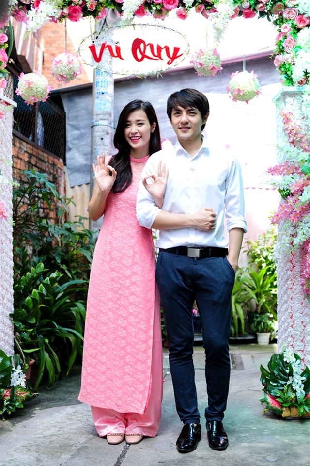 Cặp đôi nhí nhảnh trong hậu trường chụp hình.