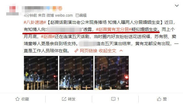 Mới đây, trong giới showbiz Hoa ngữ râm ran tin tức về tin đồn cuộc hôn nhân giữa Triệu Vy và ông xã đại gia Huỳnh Hữu Long đang rơi vào tình huống rạn nứt và đã ly thân. Nghi vấn được dấy lên khi vào ngày đóng máy bộ phim mới do Triệu Vy làm đạo diễn, những người bạn thân trong giới như Tô Hữu Bằng, Đậu Tĩnh Đồng (con gái Vương Phi),… đều đến tận trường quay để gửi tặng hoa và chúc mừng, tuyệt nhiên ông xã Huỳnh Hữu Long không có mặt.