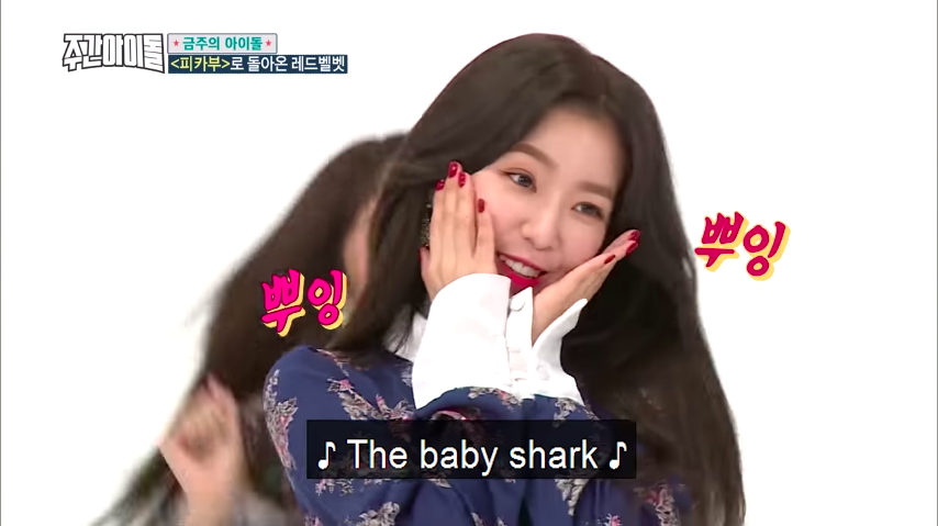 Bài hát Baby Shark với những hình ảnh đáng yêu đại diện cho các thành viên trong gia đình, kèm theo vũ đạo dễ thương đã đạt hơn 1 tỷ lượt xem trên Youtube. Ngay lập tức show tạp kỹ Weekly Idol đã nhanh chóng biến nó thành một thử thách để thể hiện sự đáng yêu và lầy lội của các thần tượng.
