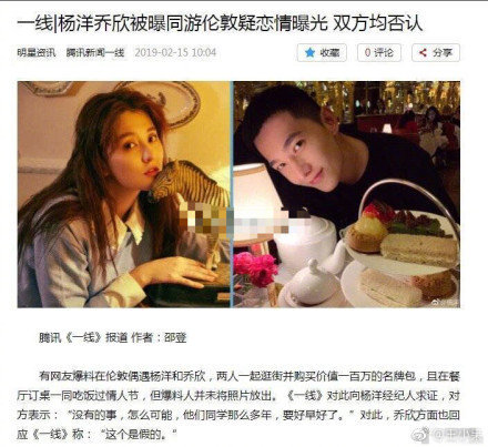 Sáng nay 15/2, trên weibo từ khóa 杨洋乔欣方否认恋情 (Dương Dương và Kiều Hân phủ nhận đang yêu) đứng đầu top search. Cư dân mạng đồn thổi rằng cặp này yêu nhau và còn có ý định sẽ kết hôn. Theo nguồn tin thì người hâm mộ thấy Dương Dương cùng Kiều Hân đi dạo phố ở London, Dương Dương mua túi xách hàng hiệu tặng cho nữ diễn viên này.
