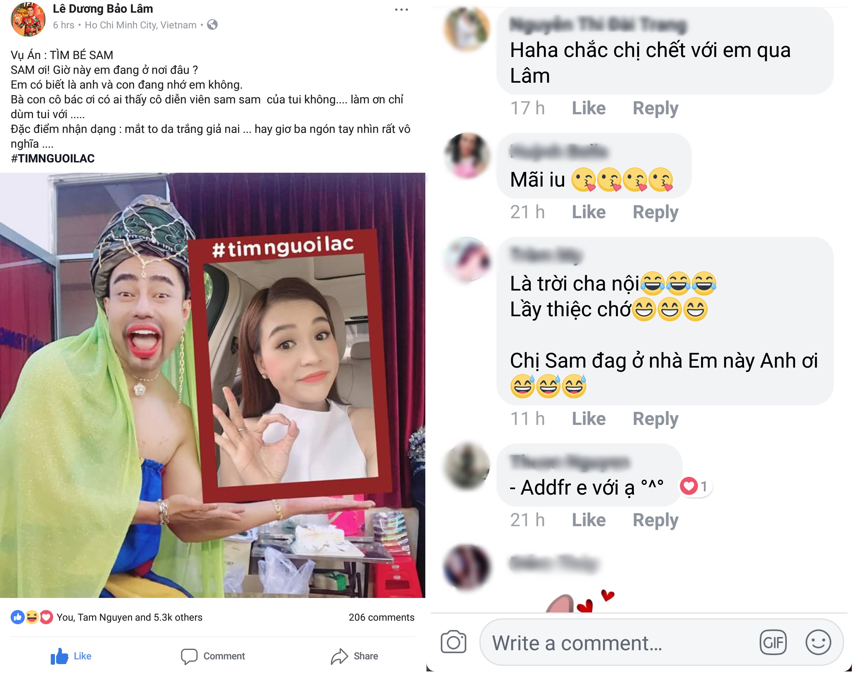 Dường như, câu chuyện của các đồng nghiệp khác đã khiến Lê Dương Bảo Lâm nôn nóng chia sẻ về việc tìm kiếm cô bạn: “SAM ơi! Giờ này em đang ở nơi đâu? Em có biết là anh và con đang nhớ em không. Bà con cô bác ơi có ai thấy cô diễn viên Sam Sam của tui không…làm ơn chỉ dùm tui với…”, đi kèm là bức ảnh biểu cảm của cô bạn để nhận dạng với “mắt to da trắng giả nai, hay giơ ba ngón tay nhìn rất vô nghĩa”.