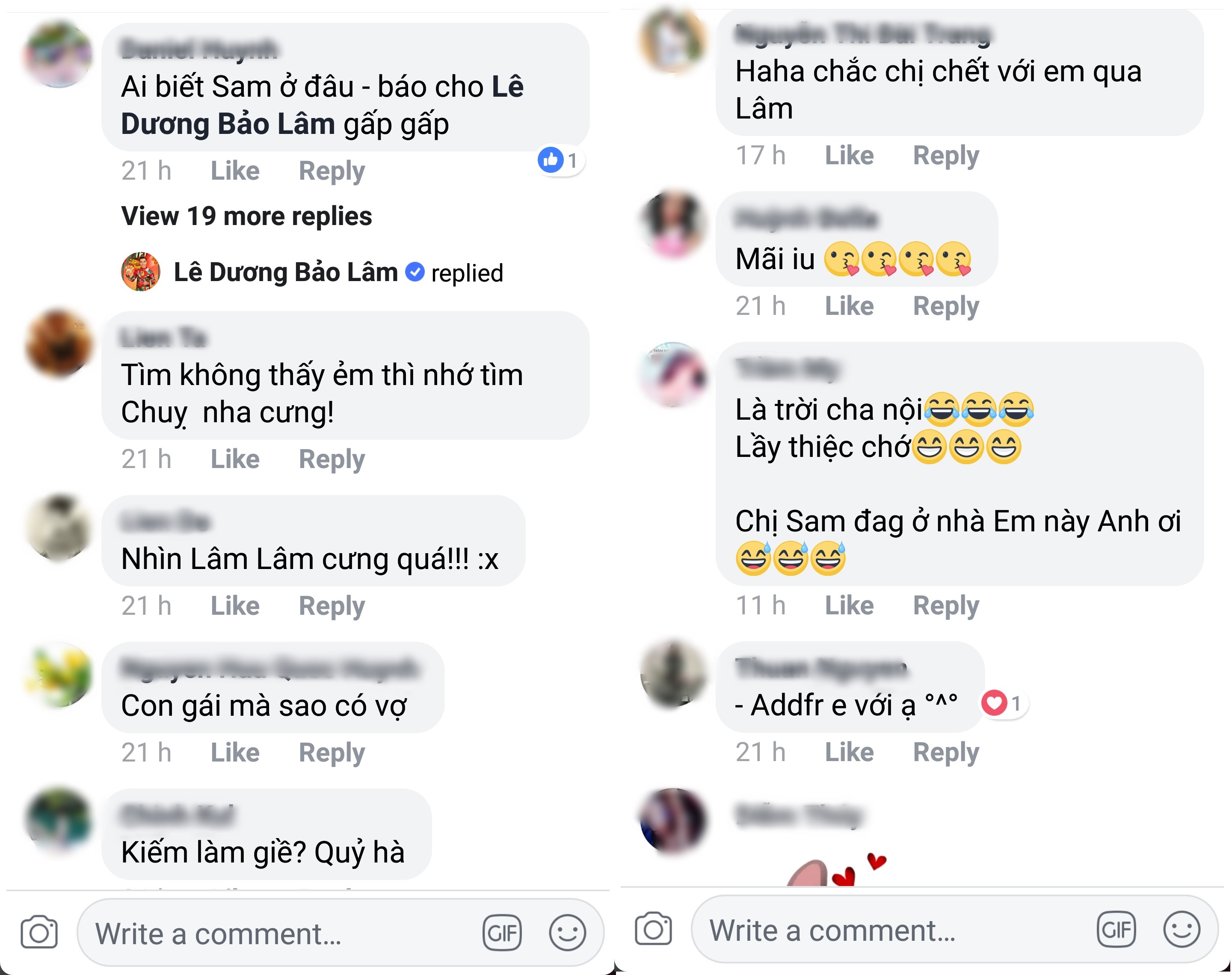 Thông tin Lê Dương Bảo Lâm tìm Sam đi lạc khiến người hâm mộ bán tín bán nghi vì cách xưng hô “anh và con” của nam diễn viên hài. Các fan hâm mộ nhân dịp này cũng đã nêu ra rất nhiều ý kiến trêu chọc lại thông tin trên status của chàng diễn viên hài.