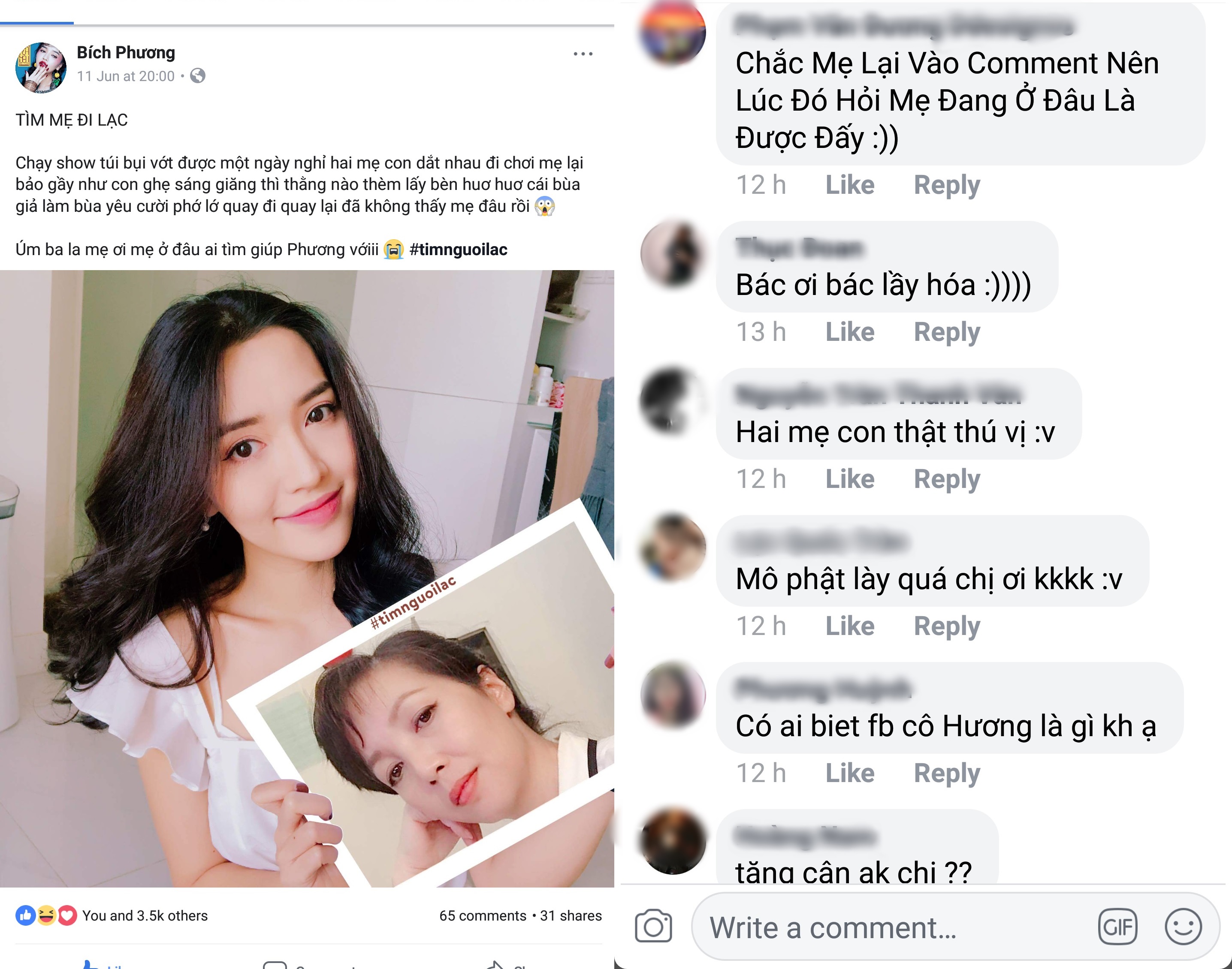 Ấn tượng nhất chính là thông tin “Tìm mẹ” của Bích Phương với thái độ khẩn khoản: “Đang dung dăng dung dẻ đi chơi, mami lại hỏi câu chuyện muôn thuở “Bao giờ lấy chồng?” Mọi lần là né rồi đó, lần này rất tự tin trả lời: “Mami yên tâm, con đã có “Bùa yêu” đây rồi, mami chuẩn bị đón cả ĐÀN con rể nhé…”, mà chưa dứt câu quay lại đã không thấy mami đâu mất tiêu! Cả nhà ơi giúp Phương tìm mami với”.