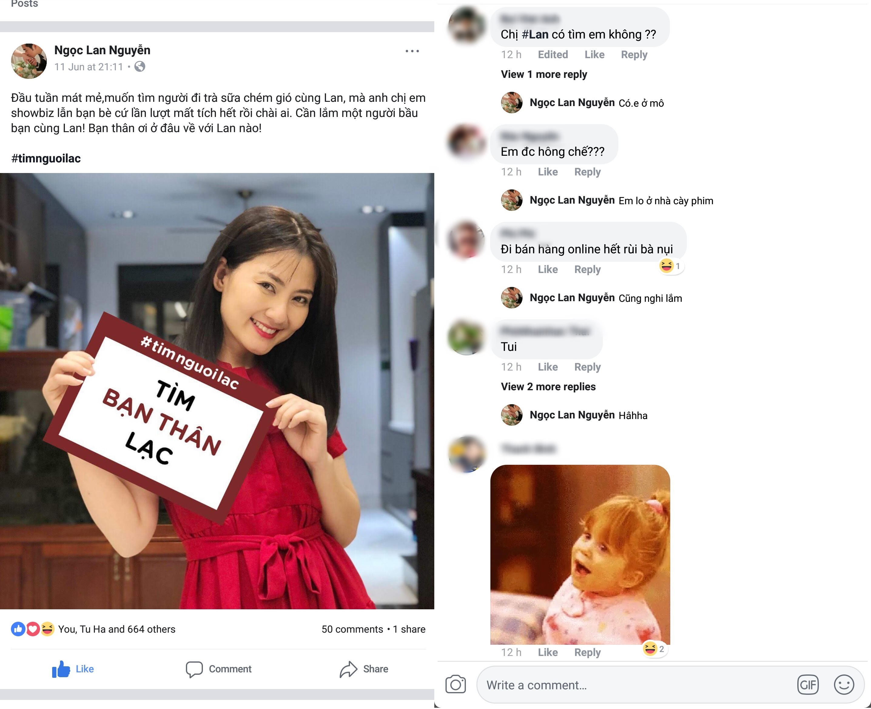 Như vậy, sau chuyện của Bảo Lâm và Bích Phương, câu chuyện các sao đi lạc đã thực sự trở thành xu hướng có thật. Ngay cả diễn viên Ngọc Lan - người tưởng chừng đứng ngoài cuộc nhưng cũng rất… có liên quan chỉ bởi “Muốn tìm người đi trà sữa chém gió cùng Lan, mà anh chị em showbiz lẫn bạn bè cứ lần lượt mất tích hết cả! Cần lắm một người bầu bạn cùng Lan! Bạn thân ơi ở đâu về với Lan nào!”.