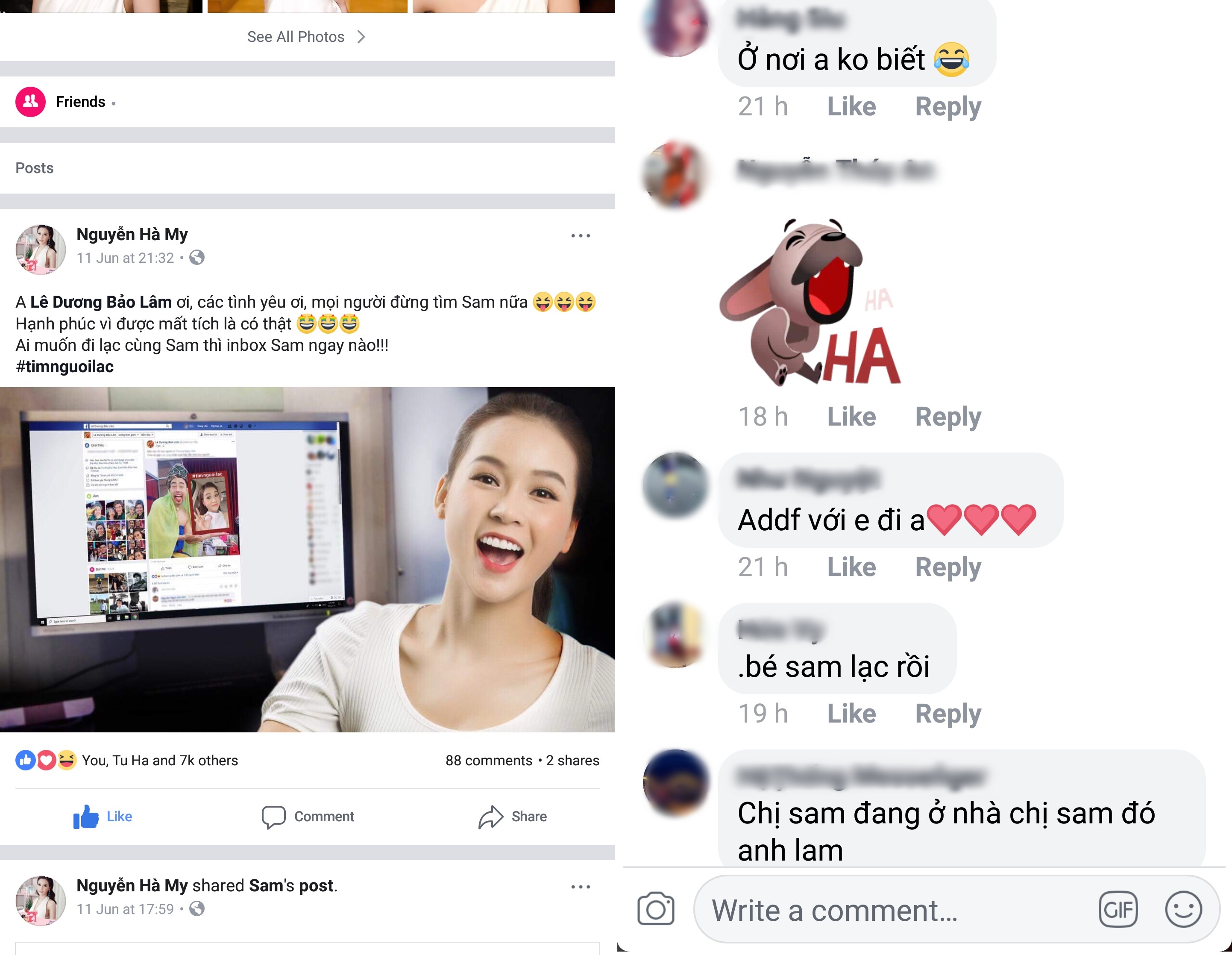 Trong tình thế nước sôi lửa bỏng đó, dòng trạng thái của Sam - người thất lạc đầu tiên đã lên tiếng. Cô tag người bạn thân Lê Dương Bảo Lâm viết: “Các fan hâm mộ ơi, mọi người đừng tìm Sam nữa. Hạnh phúc vì được mất tích là có thật. Ai muốn đi lạc cùng Sam thì inbox Sam ngay nào!!!”. Đến tình huống này, người trong cuộc gần như điên đầu còn cư dân mạng, đúng là hoang mang cực độ.