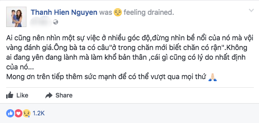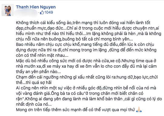 Cụ thể, Thanh Hiền viết: “Không thích cái kiểu sống ảo, trên mạng thì luôn đóng vai hiền lành tốt đẹp, chuẩn mực, đạo đức… Chỉ ai ở trong cuộc mới hiểu được chuyện như thế nào, ai hiểu mình như thế nào thì hiểu thôi… Im lặng không phải là hèn, mà là không chịu nỗi nữa nên buông, buông bỏ tất cả chỉ mong bình yên…