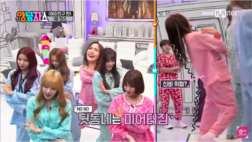 Còn với những vũ đạo bay nhảy đầy mạnh mẽ của mình,các cô nàng GFriend đều phải kìm bớt lại và di chuyển luồn lách qua nhau đầy hài hước. Và “hố đen tội lỗi” không ai khác đó chính là thành viên SinB khi xém chút nữa bật ngửa ra sau vì mải nhường chỗ cho đồng đội. Cô nàng còn tặng cho Sowon một cú đạp đau không nói nên lời khiến khán giả không thể nhịn cười. Và chính vì quá chuyên nghiệp nên dù đã rất cố gắng nhưng bộ 3 MC Eric Nam, Yang Se Hyung, Jang Do Yeon không thể nào soi ra lỗi nhảy nào của họ để đưa ra hình phạt.