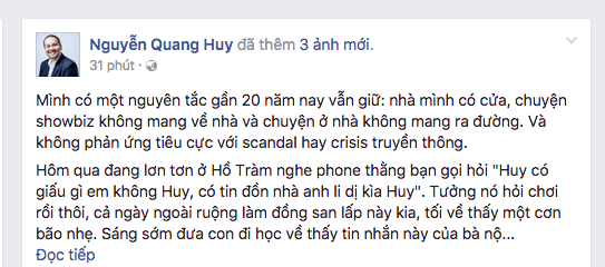 Ngoài ra, đạo diễn phim Thần tượng cho biết thêm, gần 20 năm nay anh luôn có nguyên tắc riêng, không thích phơi bày cuộc sống cá nhân trên mặt truyền thông. “Nhà mình có cửa, chuyện showbiz không mang về nhà và chuyện ở nhà không mang ra đường. Và không phản ứng tiêu cực với scandal hay crisis truyền thông” - Quang Huy viết.