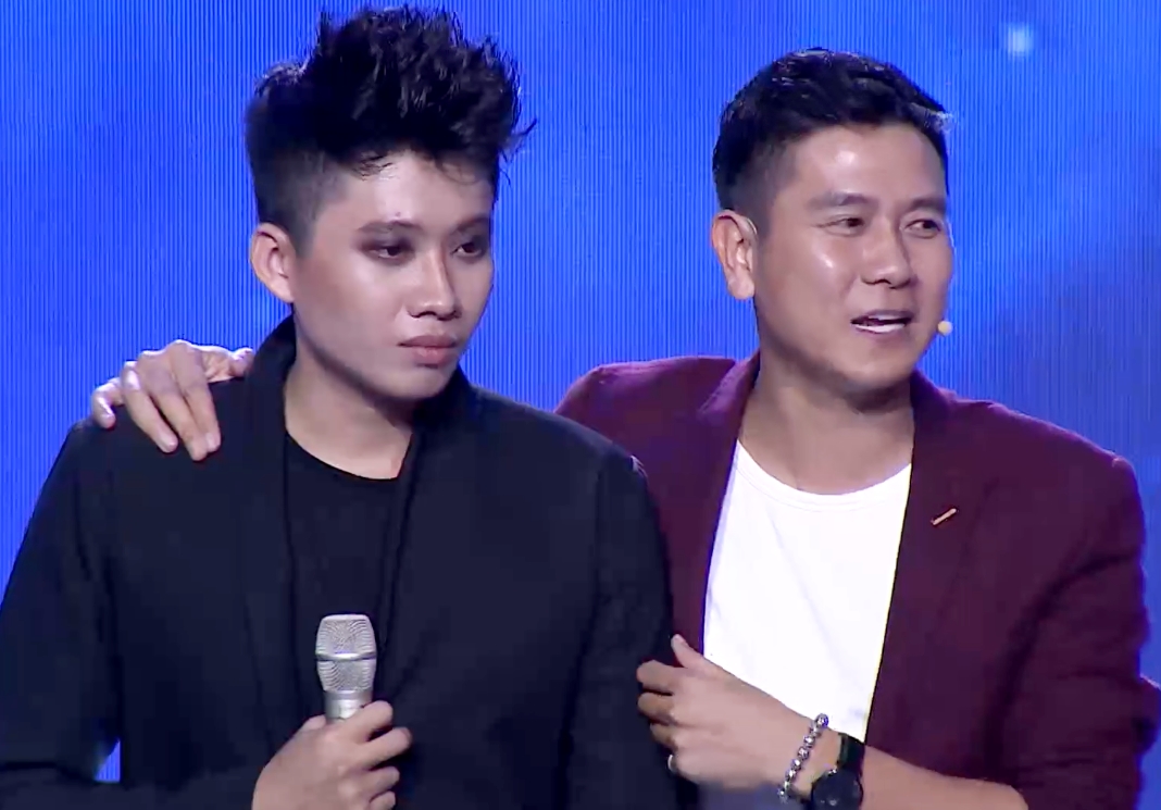 HLV Hồ Hoài Anh không giấu được niềm vui khi em út của team vượt qua trở ngại tâm lý để hoàn thành tiết mục dự thi.