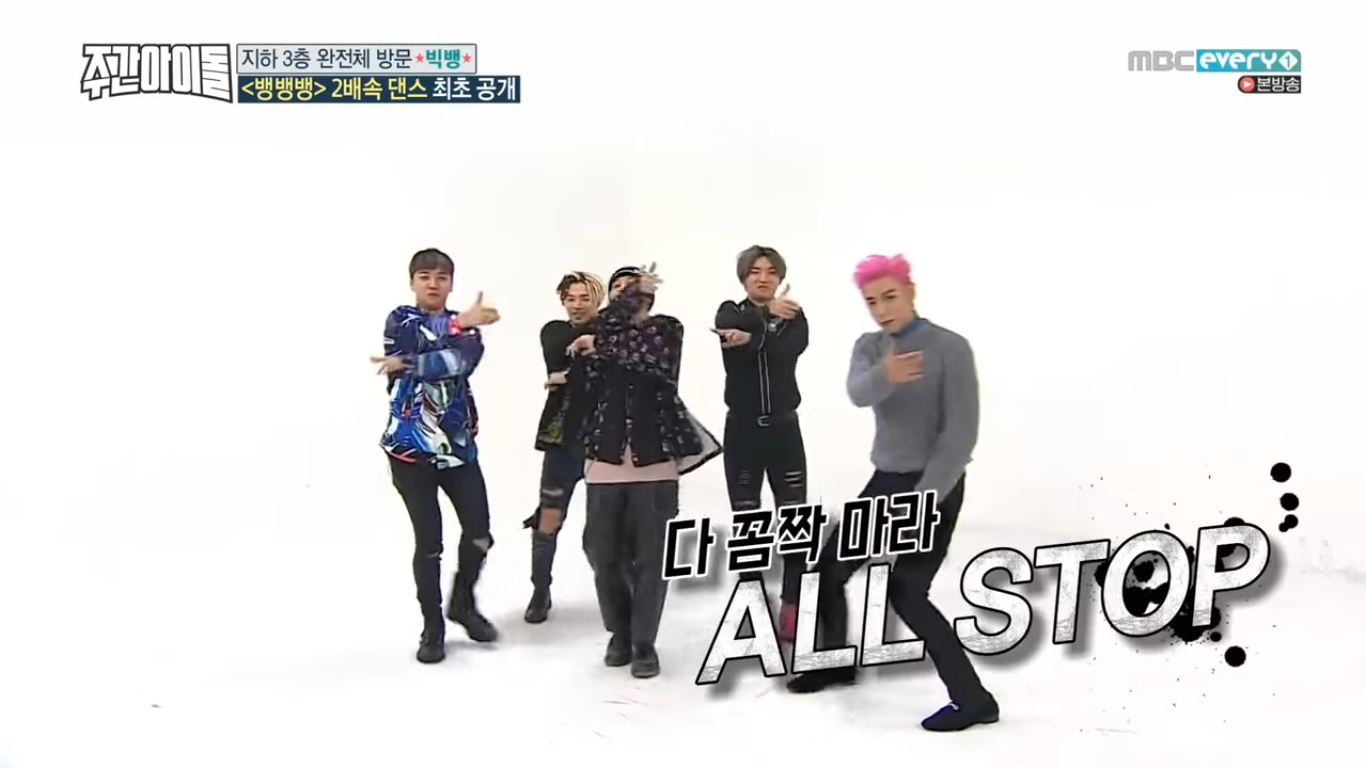 Màn so tài chưa dừng lại khi 5 anh chàng được thách thức nhảy Bang Bang Bang với cấp độ nhạc nhân 2, phần thử thách mới nhưng rất đặc sắc của Weekly Idol. Mặc dù cả 5 anh chàng đều rất sung sức khi nhạc mới nổi lên, tuy nhiên sức khỏe có hạn nên chưa đến điệp khúc tất cả đều đã bỏ cuộc nằm lăn lê trên sàn.