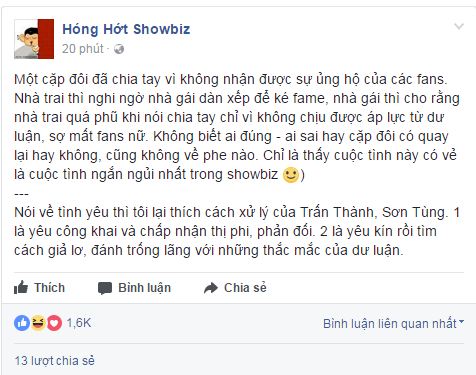 Fanpage ám chỉ vì không chịu được áp lực từ dư luận mà một cặp đôi đã chia tay.