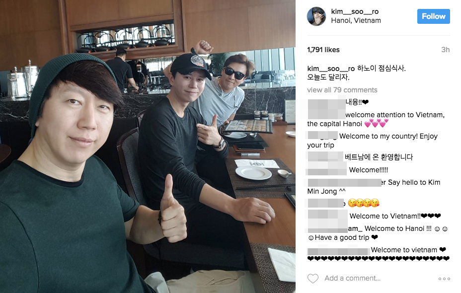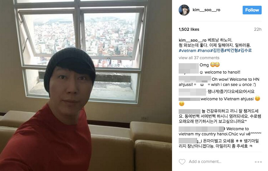 Trên Instagram cá nhân, Kim Soo Ro đã đăng tải hình ảnh trong phòng khách sạn rồi dùng bữa trưa ở một nhà hàng sang trọng. Nam diễn viên khá hào hứng, thích thú khi đặt chân tới Hà Nội.