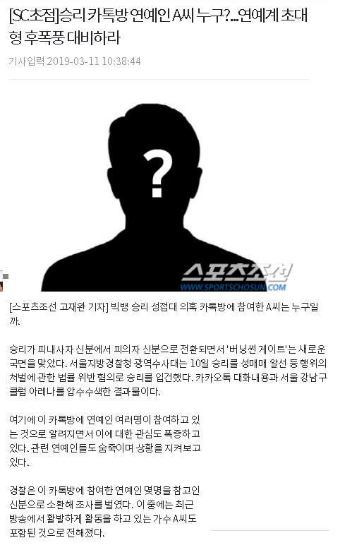 Tin tức mới nhất sáng nay, tờ Sport Chosun chia sẻ, scandal môi giới mại dâm của Seungri đang bước sang một giai đoạn mới khi nam idol trở thành nghi phạm. Cảnh sát cho biết trong phòng chat Kakaotalk cách đây 3 năm có sự tham gia của nhiều người nổi tiếng. Mới đây, họ đã gọi A - người debut là ca sĩ nhưng nổi tiếng nhờ TV show lên để thẩm vấn. Cả làng giải trí đều nín thở theo dõi tình hình. Cho dù A có được thả ra hay không thì danh tính cũng sắp bị tiết lộ.