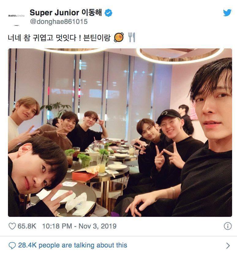 Bên cạnh đó, thành viên Dong Hae cũng chia sẻ hình ảnh selfie của 2 nhóm trong 1 buổi ăn cùng nhau. Anh viết: “Những người bạn thật dễ thương và tuyệt vời!”