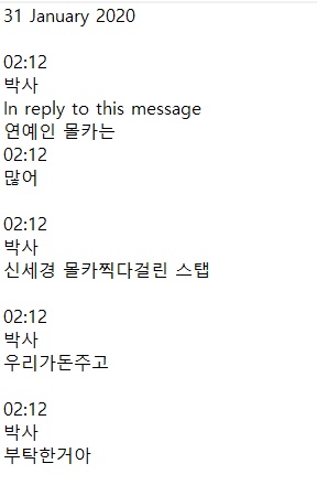 Vào khoảng 2h12 (KST) ngày 31/01, Jo Joo Bin với biệt danh Tiến sĩ đã có một cuộc hội thoại như sau: “Có rất nhiều camera ẩn của nghệ sĩ nổi tiếng. Mấy thằng nhân viên bị bắt khi quay lén Shin Se Kyung đã bắt bọn tao trả tiền. Vì trước đây mấy đứa đó chưa từng làm chuyện này nên còn gà lắm”. Sau đó, một hội viên phòng chat hỏi: “Tiền bạc thế nào chú em?”, hắn ta trả lời: “Tính sau. Nếu thành công thì 3 triệu won (khoảng 58 triệu đồng)“.