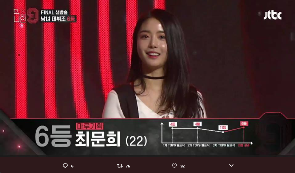 Choi MoonHee thực tập sinh của Maroo entertainment, cô nàng đã dành vị trí thứ 6 trong chung cuộc trong team nữ của MIXNINE nhưng không được ra mắt.