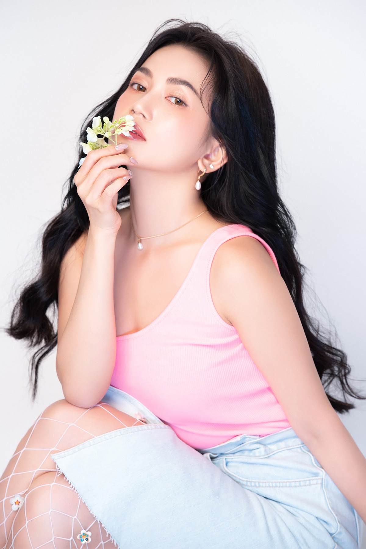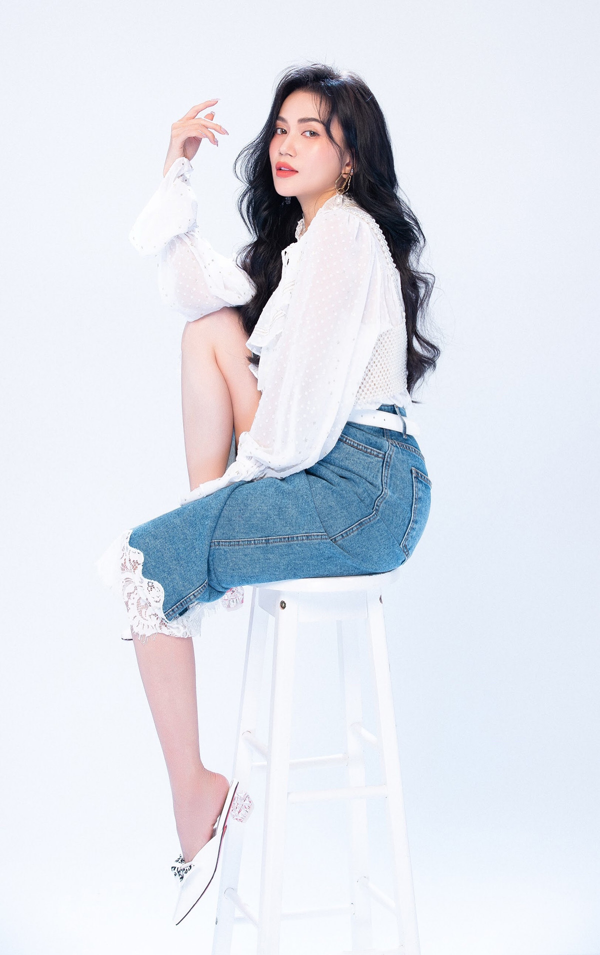 Hoặc với bộ trang phục hồng - xanh lam nhạt, lựa chọn này mang lại sự gợi cảm hơn một chút nhờ chiếc áo không tay và váy jeans ngắn vạt chéo, vừa đủ “đóng” để không quá phô bày nhưng cũng vừa đủ “mở” để mang phong cách gợi cảm. Ngoài ra, Sĩ Thanh gợi ý, chất liệu ren cũng là một chất lượng thú vị cho các cô gái để có thể chọn trong Tết này với mục đích tăng sự gợi cảm, nữ tính nhưng vẫn nền nã, dịu dàng.