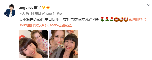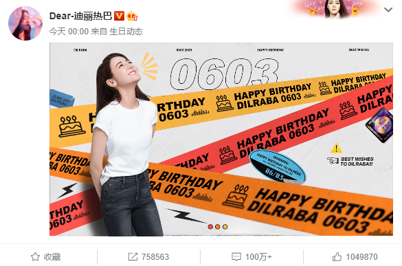 Khi đồng hồ điểm đúng 0 giờ ngày 03.06, tài khoản Weibo của Địch Lệ Nhiệt Ba hiện lên bài viết mừng sinh nhật tuổi 28 của cô. Hiện tại có hơn 100 ngàn lời chúc mừng sinh nhật từ fan hâm mộ gửi đến Địch Lệ Nhiệt Ba và bài viết này cũng nhanh chóng vượt mốc 1 triệu like. Tuy nhiên, giữa “đại dương” bạt ngàn những lời chúc ngọt ngào, chỉ có hiếm hoi hai cái tên từ giới giải trí dành thời gian để chúc mừng mỹ nhân Tân Cương.