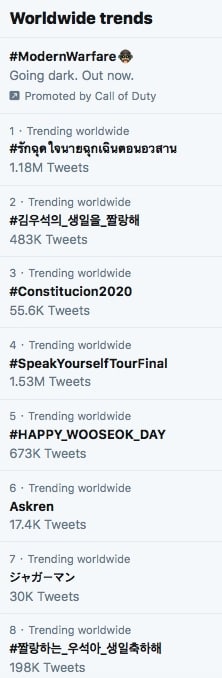 Vào lúc 1h32 sáng (KST), ba trong số tám xu hướng hàng đầu trên toàn thế giới ở Twitter được dành riêng cho Kim Woo Seok, bao gồm hai hashtag bằng tiếng Hàn với cách gọi tinh nghịch theo biệt danh của cậu là “Jjallang-ie”. Hashtag đó dịch sang tiếng Việt có nghĩa #Chúng tôi yêu sinh nhật của Kim Woo Seok đứng ở vị trí thứ hai trong danh sách. Tiếp đến, hashtag tiếng Anh #HAPPY_WOOSEOK_DAY ở vị trí thứ 5, và cuối cùng hasgtag từ tiếng Hàn có nghĩa #Chúc mừng sinh nhật Woo Seok yêu quý của chúng ta hạng 8.